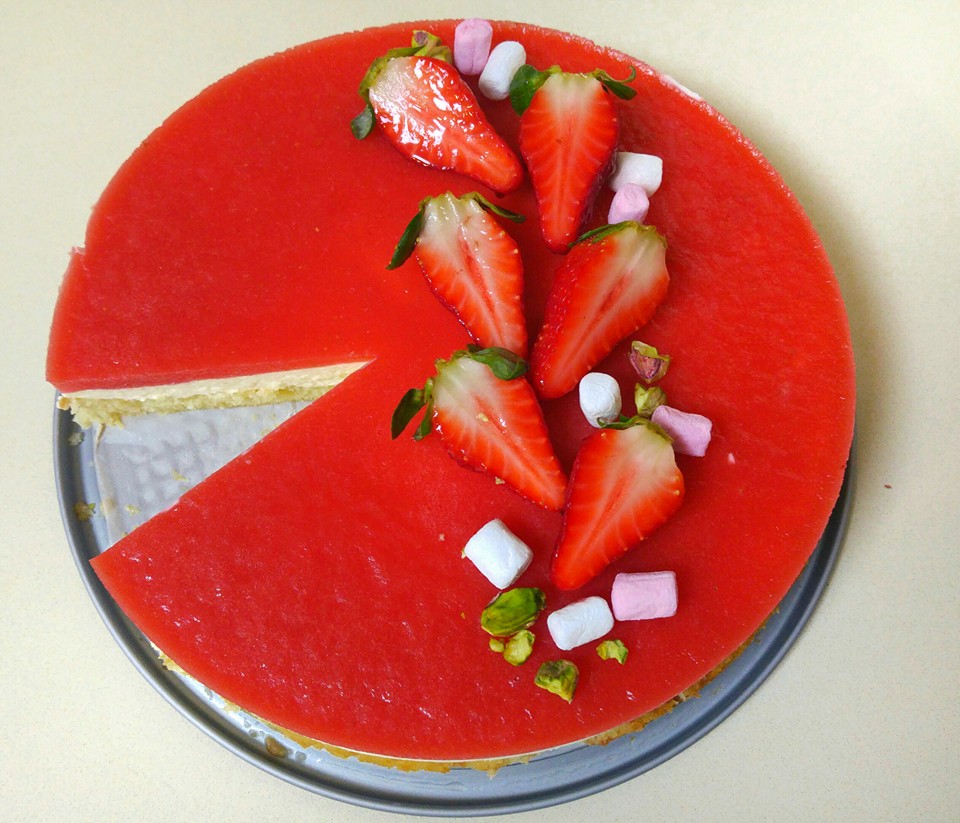 לאחר ההמתנה לשפוך את רוטב התותים על העוגה, להכניס למקפיא ל - 20 דקות ,